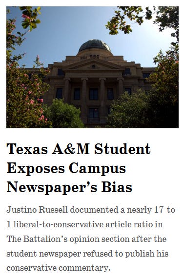 That made me suspicious, so I decided to do some research. After reading all the opinion section articles from November 2024 to November 2025, I found that The Battalion’s opinion section operates on a staggering 17-to-1 ratio of leftist to conservative content (and that’s only the opinion section!). This story was later featured by Texas Scorecard and The College Fix as their most-read article of the month.