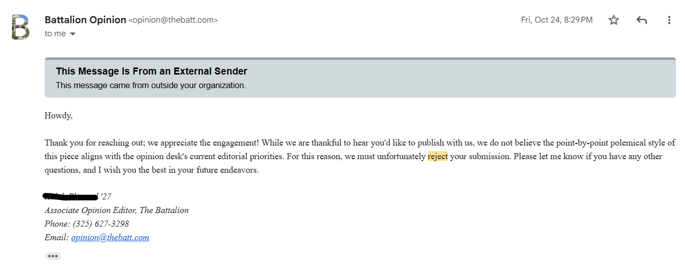 After a Texas A&M professor was fired for teaching the “gender unicorn,” and the university president was later forced to resign after gaslighting the student who reported it, The Battalion published an anonymous letter from a liberal professor addressed to the student body, condemning the firing. I found that letter misleading, dishonest, and harmful, perpetuating many of the very problems currently facing higher education. In response, I wrote and submitted a rebuttal to that anonymous professor (titled Dear Anonymous Professor). After two weeks of following up, The Battalion finally responded, only to reject my submission, citing that it was “polemical” and “not in line with our current editorial priorities”.
